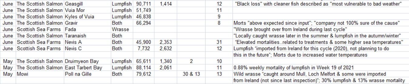 'Case Information' published by the Scottish Government's Fish Health Inspectorate for an inspection in June 2021 detailed “elevated mortalities” of cleaner fish “related to treatments and some higher sea temperatures for lumpfish” at the Nevis A salmon farm operated by Scottish Sea Farms in Loch Nevis (Cases 2021-0182, p71-3).  The site was stocked with 33,000 lumpfish and 12,900 wrasse and 146,000 salmon (a ratio of ca. 1 cleaner fish per 3 salmon).