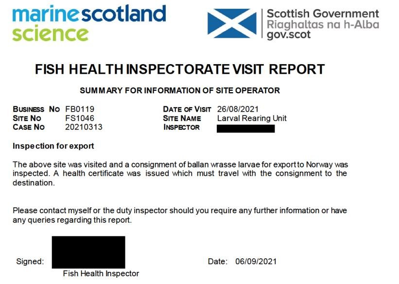 'Case Information' published by the Scottish Government's Fish Health Inspectorate for an inspection in August 2021 (Case 2021-0313, p104-111) details 2,000 Ballan wrasse broodstock at Mowi's Larval Rearing Unit at Macrihanish in Argyll with 1 million ova exported to Norway: