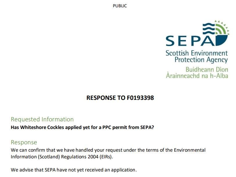 The Scottish Environment Protection Agency (SEPA) told Scottish Salmon Watch in a FOI reply dated 14 July 2021 that Whiteshore Cockles had still not yet applied for a Pollution Prevention & Control licence/permit: