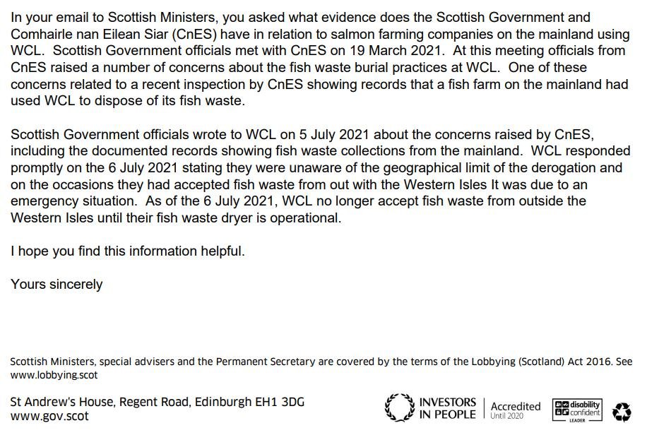 Revealed: Scottish Government wrote to Whiteshore Cockles re. concerns raised @cne_siar over the import of diseased salmon from the mainland (in contravention of their derogation i.e. being permitted to break EU law) @scotgov @MairiMcAllan @ScottishEPA https://t.co/HUi4MeAwYg pic.twitter.com/w1it4uV45y