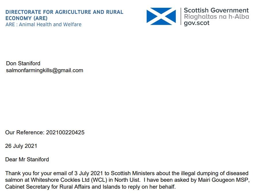 Another letter from the Scottish Government to Scottish Salmon Watch dated 26 July 2021 claimed that the continued dumping of diseased farmed salmon at Whiteshore Cockles was not 'illegal' (something which Scottish Salmon Watch certainly takes issue with):