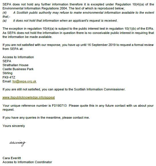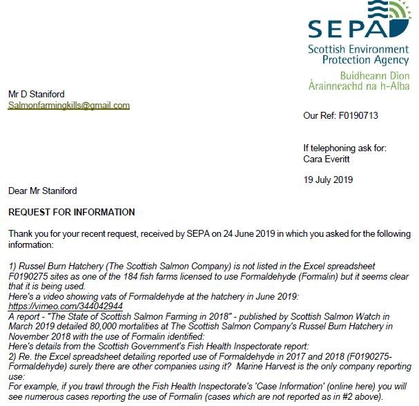 Scottish Salmon Watch wrote to SEPA (copied to Donald Cameron MSP) on 12 July 2019: