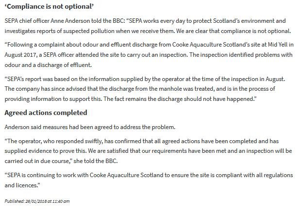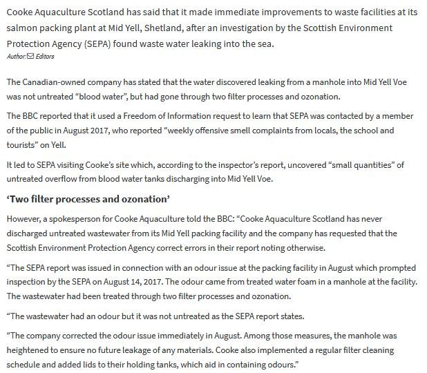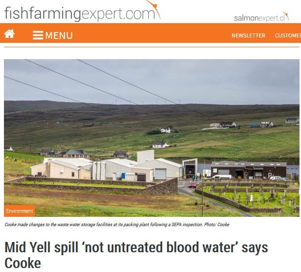 Fish Farming Expert: “Mid Yell spill ‘not untreated blood water’ says Cooke” January 26, 2018 Fish Farming Expert reported (26 January 2018): Read more via: International Business Times: "Scottish waters flooded with salmon blood after food plant leaks" Shetland News: "Salmon firm allowed discharge of effluent" Undercurrent News: "Cooke Scotland plant found to have leaked blood water" Shetland Times: "Salmon company reacts over 'blood water' issue" Press Release: "Cooke's Untreated Blood Water is 'Gross' says SEPA" BBC Radio Shetland on Cooke's "untreated blood water" in Scotland BBC News: "Shetland salmon packing factory leaks 'blood water' into sea"