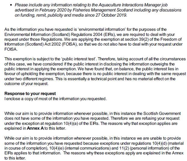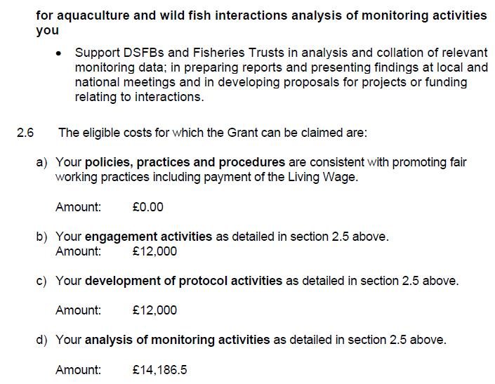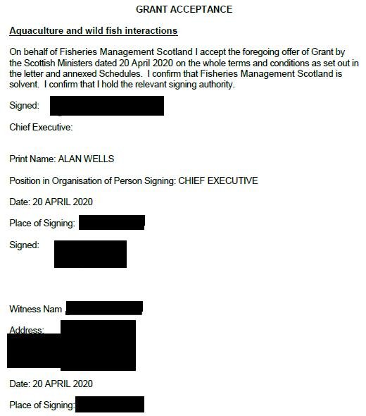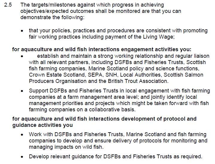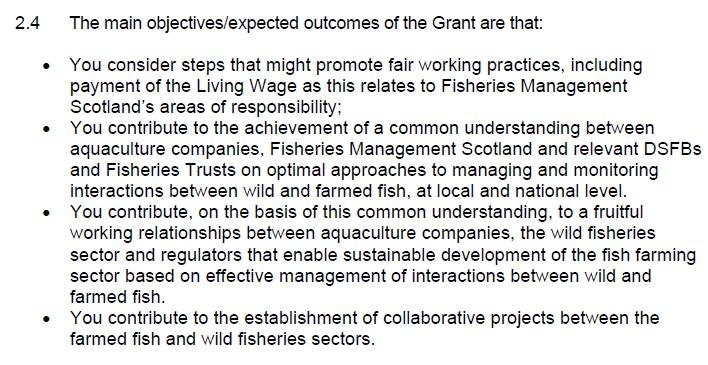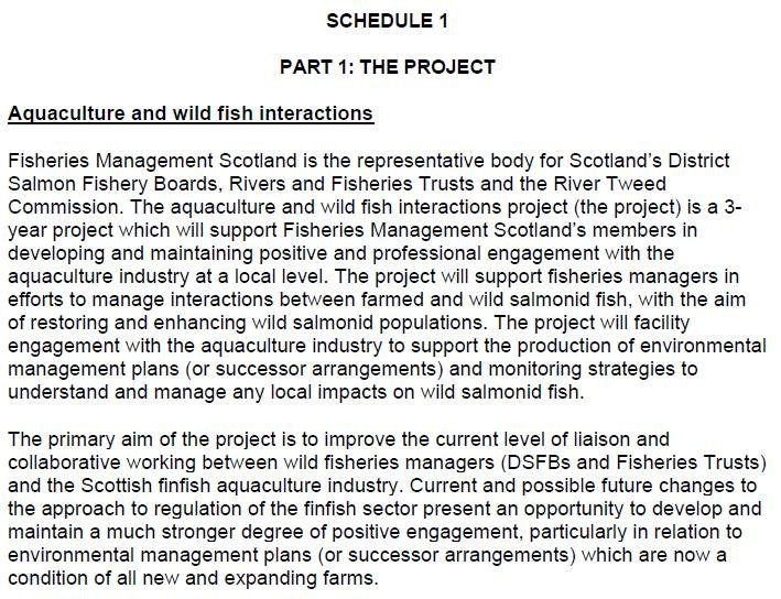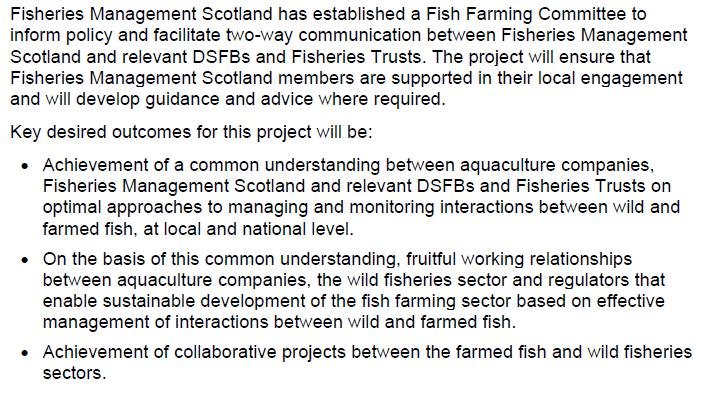 A £38,186.50 per year contract (understood to be funded for 3 years) awarded by Scottish Ministers to Fisheries Management Scotland in April 2020 specifies as one of the main "objectives/expected outcomes" of the newly appointed 'Aquaculture Interactions Manager':