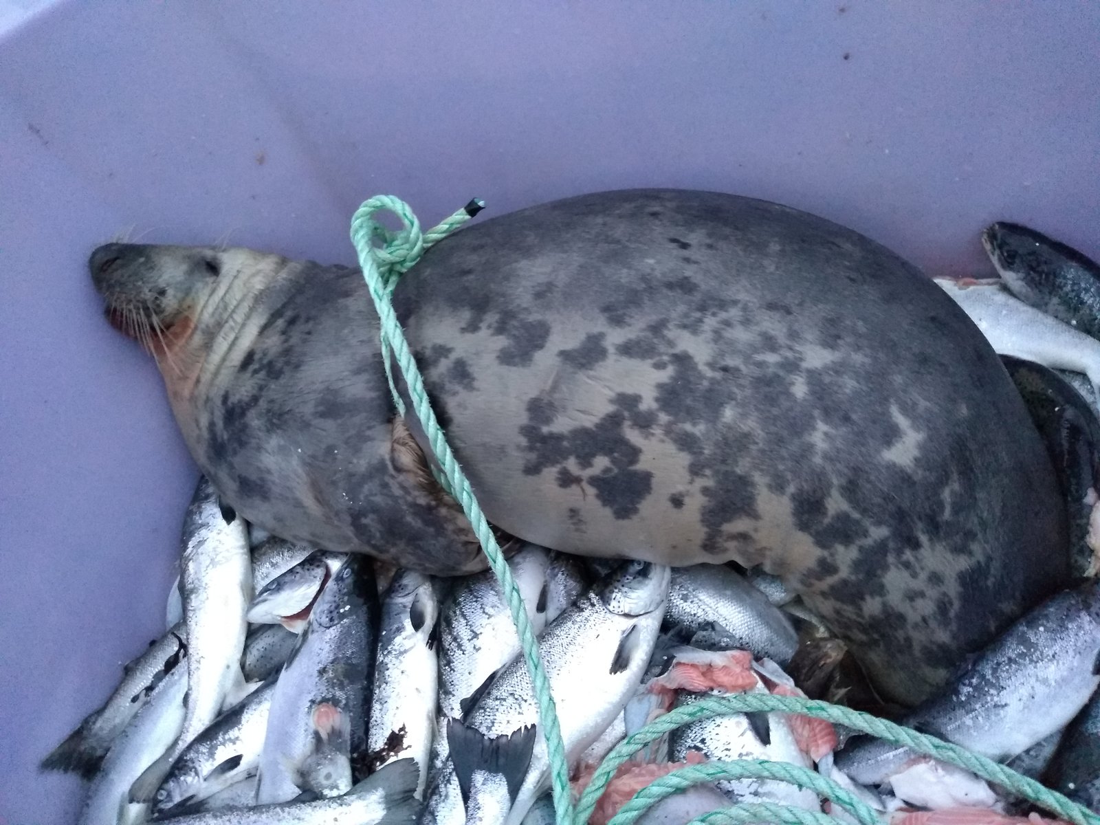 Photo: Seal in bin with farmed salmon (The Scottish Salmon Company, Taranaish salmon farm in Loch Roag) January 2020