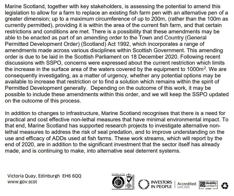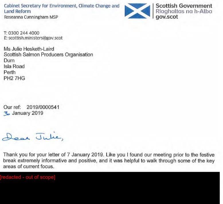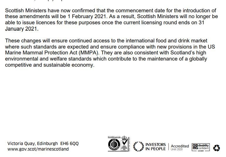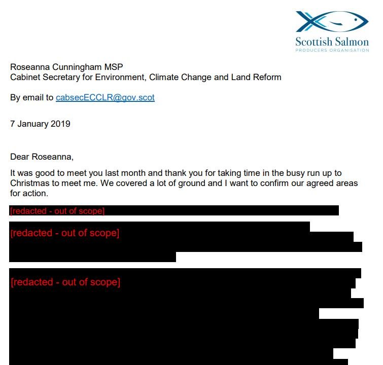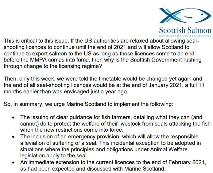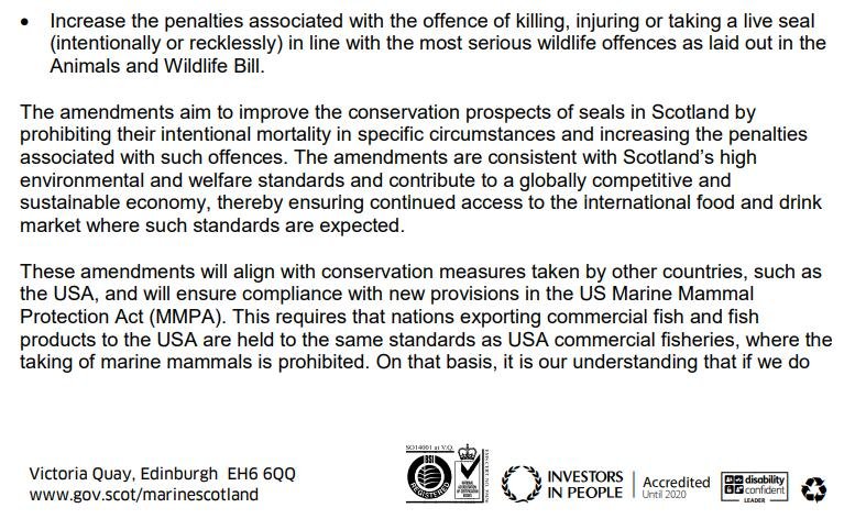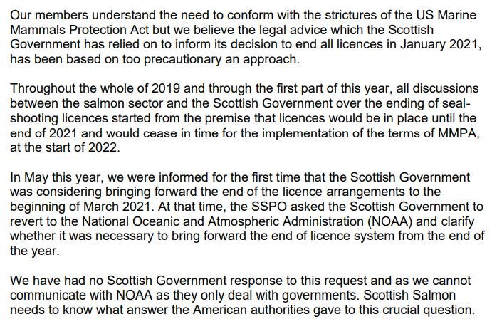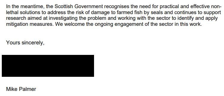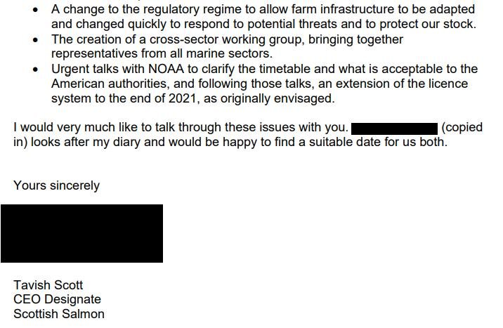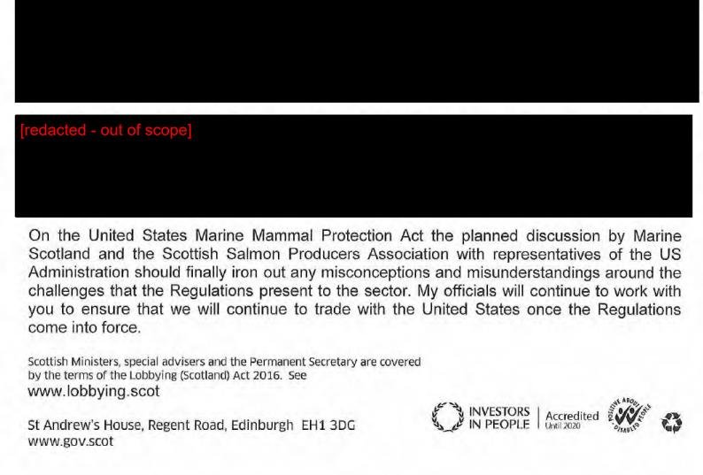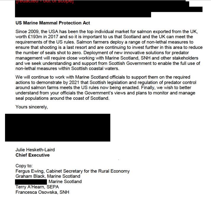 The disclosure by the Scottish Government – FOI 202100209041 – EIR Review compiled docs for requestor – 25 June 2021 – includes letters from the Scottish Salmon Producers Organisation (the lobby group for six foreign-owned companies who control 99% of 'Scottish' salmon) and replies from the Scottish Government in the wake of the US Government's proposed ban on imports of Scottish salmon sourced from farms killing seals.