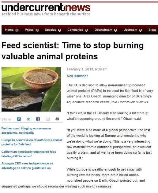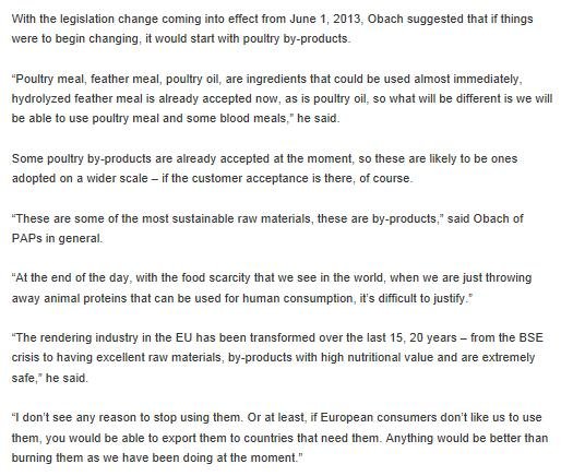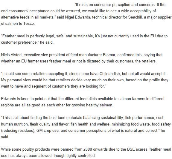 Salmon feed giant Nutreco (former owner of Marine Harvest and the world's largest fish feed manufacturer) is lobbying to use poultry meal, blood meal, meat and bone meal.  Undercurrent News reported (1 February):