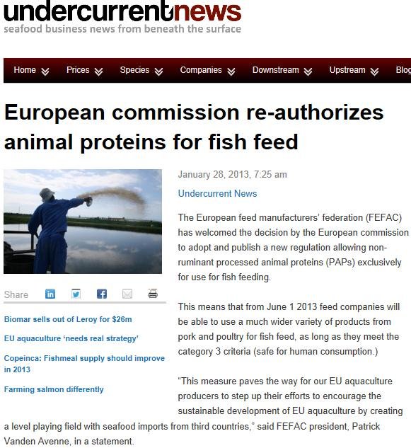 Under new European Union rules, the use of chicken and pork products will be permitted for use in salmon feed from June this year.   Undercurrent News reported last month (28 January):