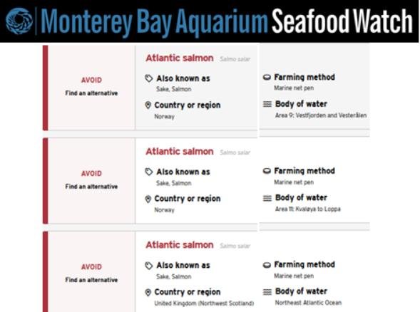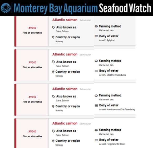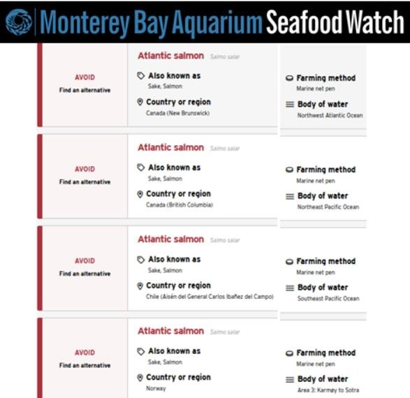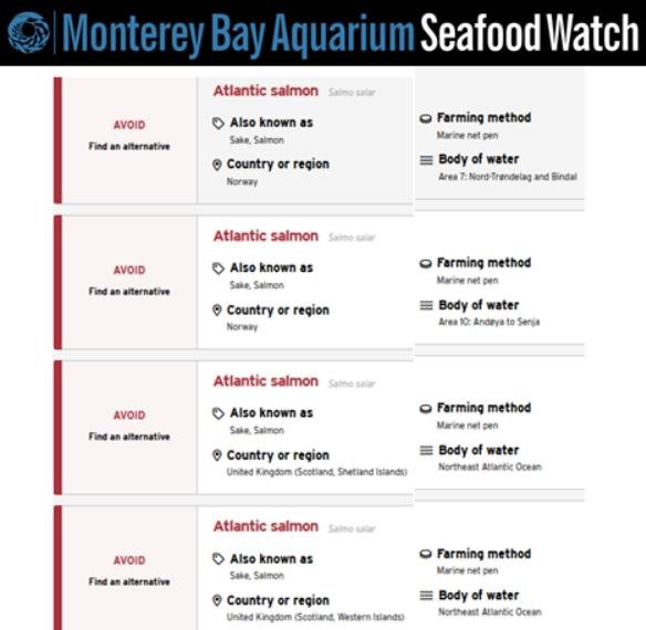 Seafood Watch's new assessments for farmed salmon give a "red" (i.e. avoid) rating for 19 regions of the world in Scotland, Norway, Chile and Canada: