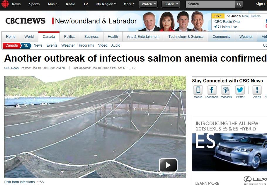 of salmon virus confirmed at fish farm in southern Newfoundland” (The Canadian