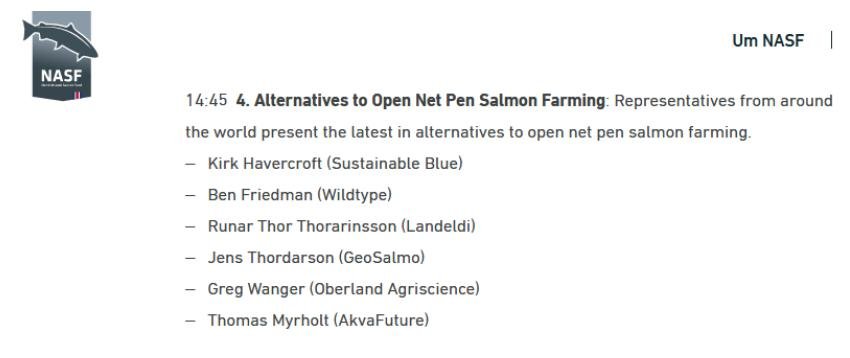 The North Atlantic Salmon Fund (NASF) admit on their website that they “promote cleaner, more sustainable alternatives” to open net cage salmon farming. NASF’s ‘Seafood Summit’ took place this week (16/17 March 2023) in Iceland – including presentations by pro-salmon farming businesses and advocates: