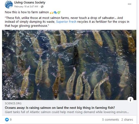 Last month (16 February 2023), Living Oceans Society championed land-based salmon farming in a post on Facebook: