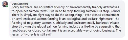 I respect the fact that others do not share this view and people are obviously free to collaborate, compromise and coordinate with pro-salmon farming interests. I will not be party to such discussions but am always available to provide input to any discussions aimed solely at stopping salmon farms in the sea or on land.