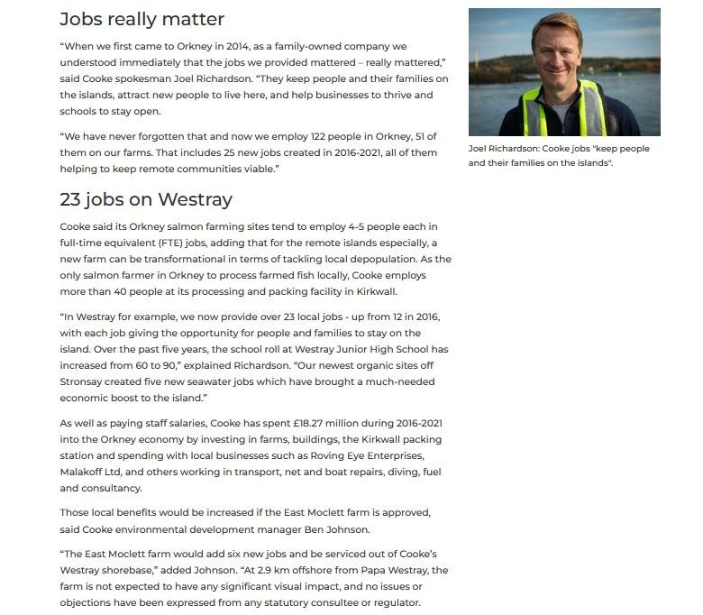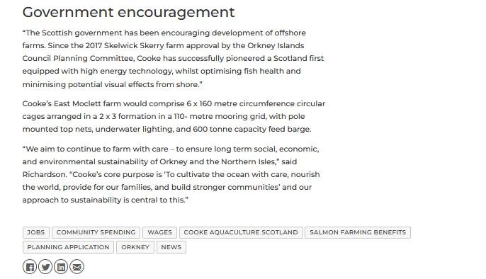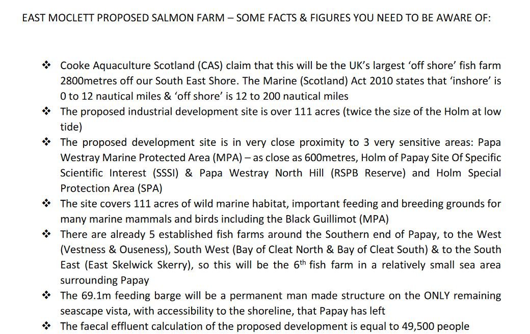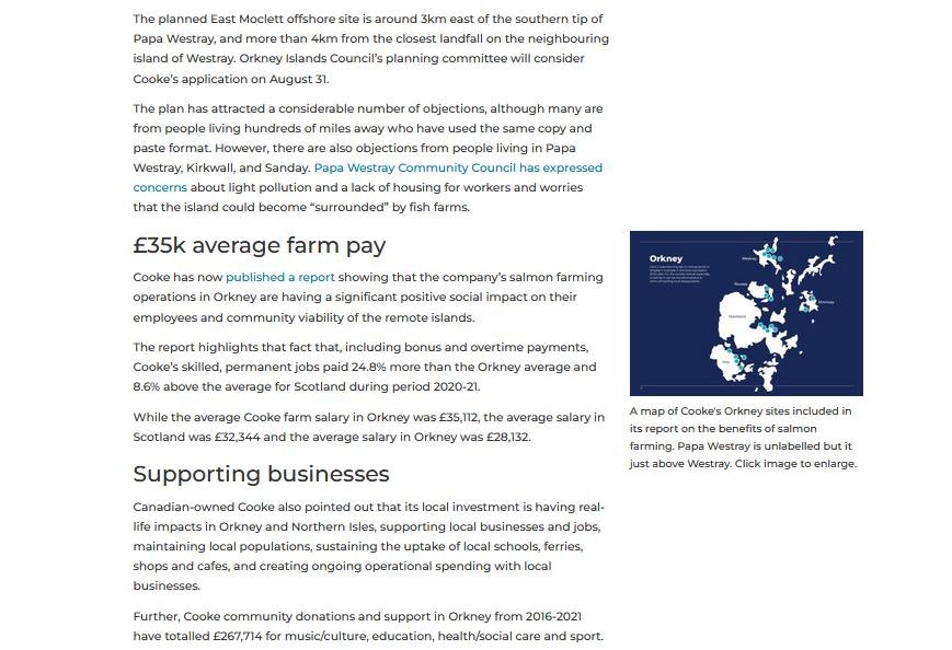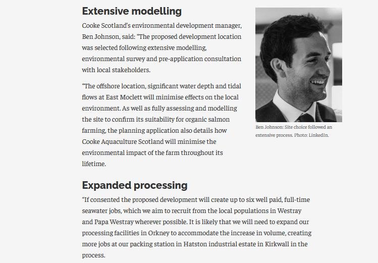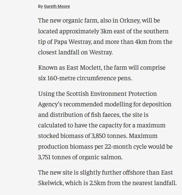 Here's some information circulated locally on Orkney by opponents of Cooke's proposal for a super-sized salmon farm at East Moclett off Papa Westray: