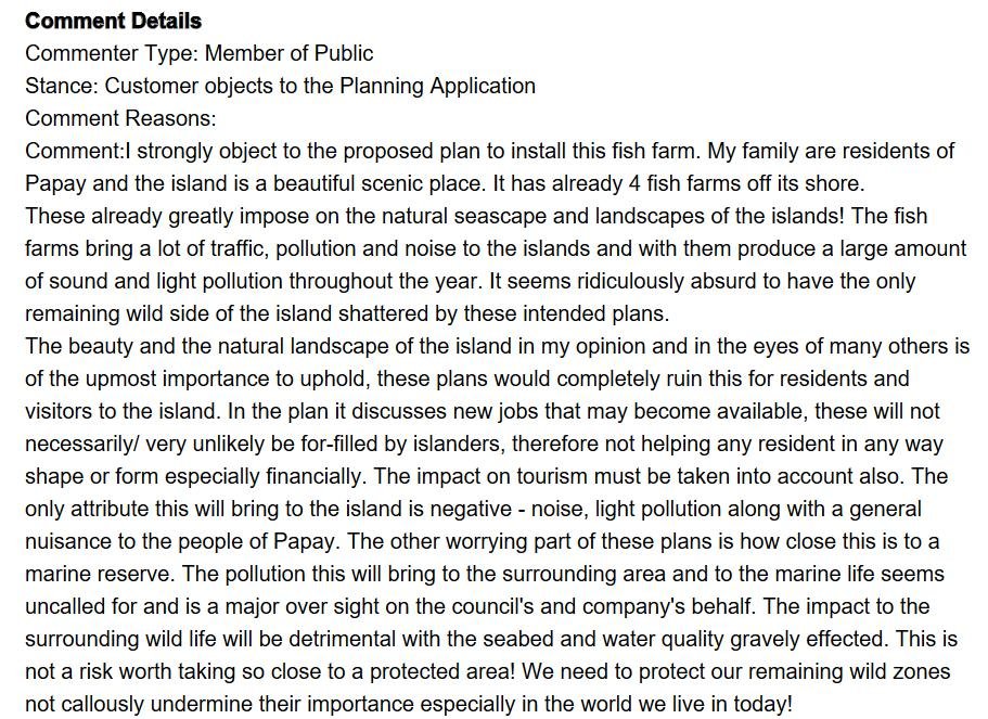 "I am a resident of Papay & object in the strongest terms to this fish farm. It will bring no benefits to the island & much harm to the environment & marine life. Do we have to invite David Attenborough to get people to see sense?" (Sylvan Jenaer @OrkneyCouncil)@cookeseafood pic.twitter.com/9snQWcZ5ir