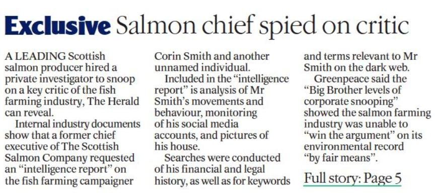 - Herald/Ferret: "Scottish Salmon Company chief hired investigator to 'snoop' on fish farming critic"