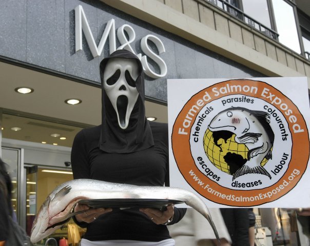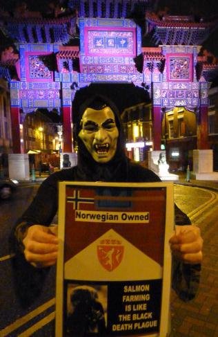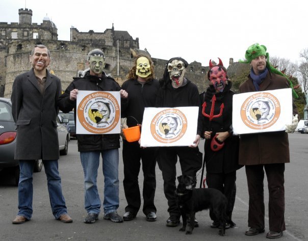 In 2007, the Pure Salmon Campaign led a protest in Edinburgh, Scotland, asking consumers to avoid scary Scottish farmed salmon like the plague.