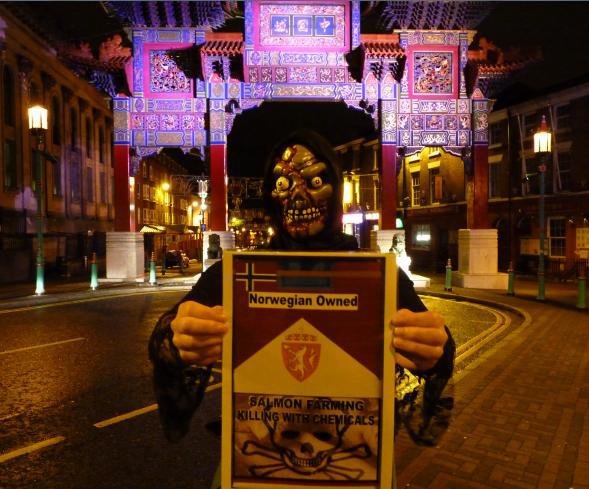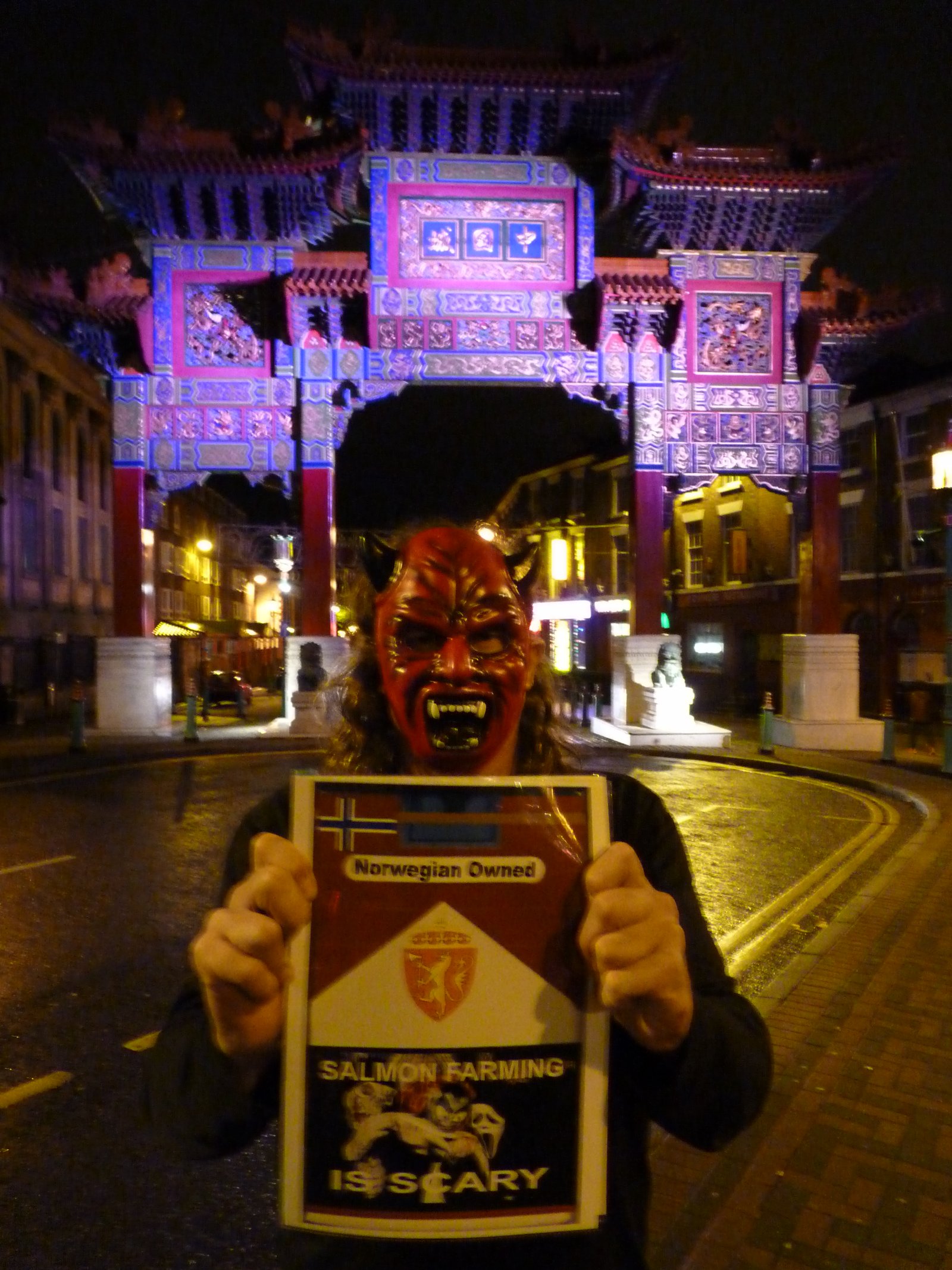 As the media in Canada prepares to feast on the Cohen Commission's final report due out later today (12.30pm Pacific Standard Time), protestors in the UK sent out a message to the Chinese Government that salmon farming is scary!