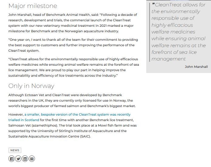 Pumping up the PR: "More than 34 million farmed salmon have been treated for sea lice with the novel bath treatment Ectosan Vet [the banned neonicotinoid Imidacloprid] since it started being used commercially in Norway a year ago" @WeAreBenchmark @scotgp https://t.co/CR6AIyhdSU pic.twitter.com/hYaJsiGyNn