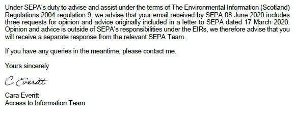 Another FOI reply from SEPA dated 26 June 2020 (FO191905) included: