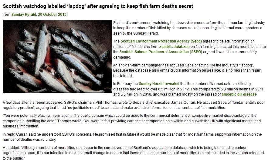 In 2013. SEPA was labelled a 'lapdog' for cravenly kowtowing to the salmon farming industry's demands to keep the numbers of dead farmed salmon secret because it was "commercially damaging":