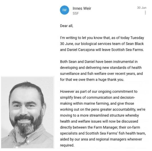 The email from Innes Weir (30 June 2020) told staff at Scottish Sea Farms that the biological services team of Sean Black and Daniel Carcajona "will leave" even though they "have been instrumental in developing and delivering new standards and fish welfare over recent years".