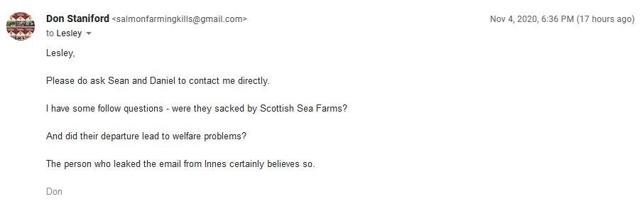 Lesley has not replied this this email but perhaps she's too busy dealing with all the negative publicity at Scottish Sea Farms.