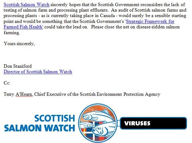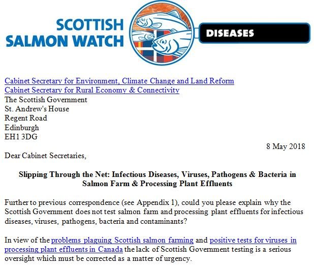 Letter to Scottish Government re. Infectious Diseases in Salmon Farming Effluents May 8, 2018 Download the letter in full as a PDF online here The letter concludes:
