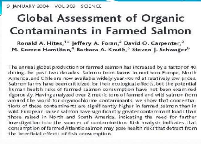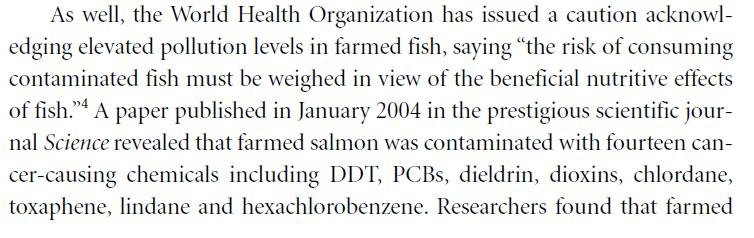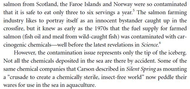 The damning revelations of cancer-causing chemicals in farmed salmon, reported in the journal Science in 2004, were long known to the salmon farming industry (just as the tobacco industry knew about the effects of nicotine and the links between smoking and cancer decades before they became widely known publicly).