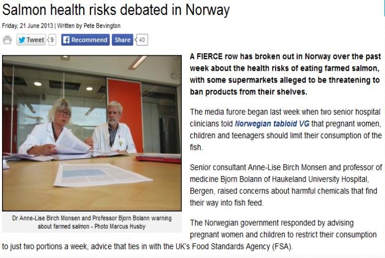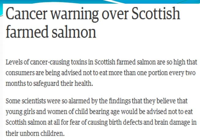 Just last month, the UK's biggest-selling newspaper (the Daily Mail), published damning findings of cancer-causing contaminants such as DDT and Dieldrin in Norwegian and Scottish farmed salmon on sale in supermarkets across England, Wales and Scotland.