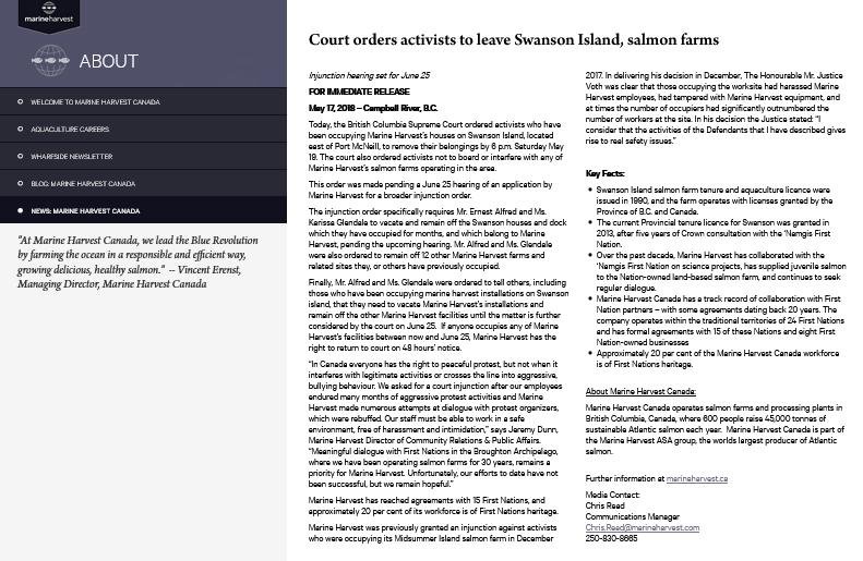 Marine Harvest Canada's May 2018 newsletter reports: