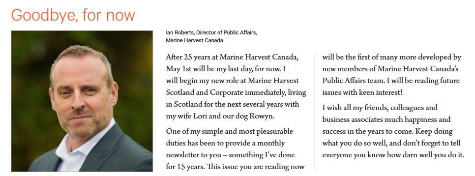 The phrase 'out of the frying pan and into the fire' springs to mind on reading the news that Marine Harvest Canada's Director of Public Affairs (Ian Roberts) is moving to Scotland and Marine Harvest Scotland's Environment Manager (Chris Read) is moving to Canada in an apparent job swap for three years.