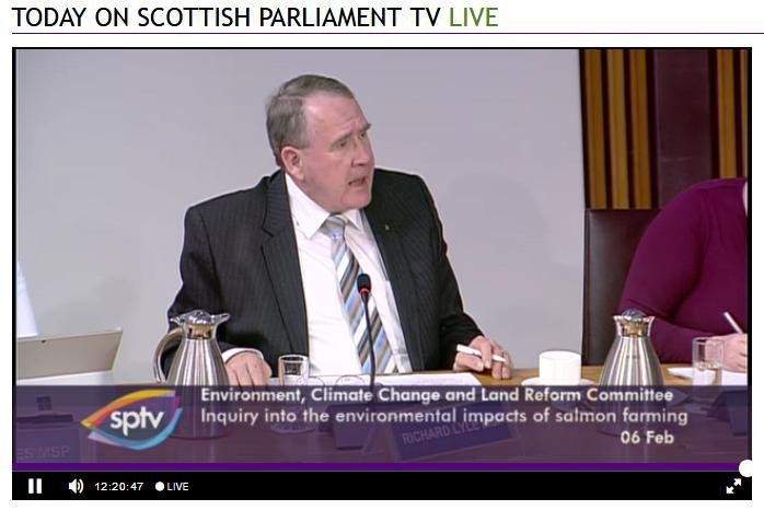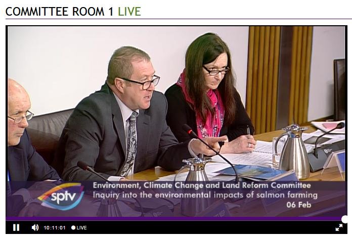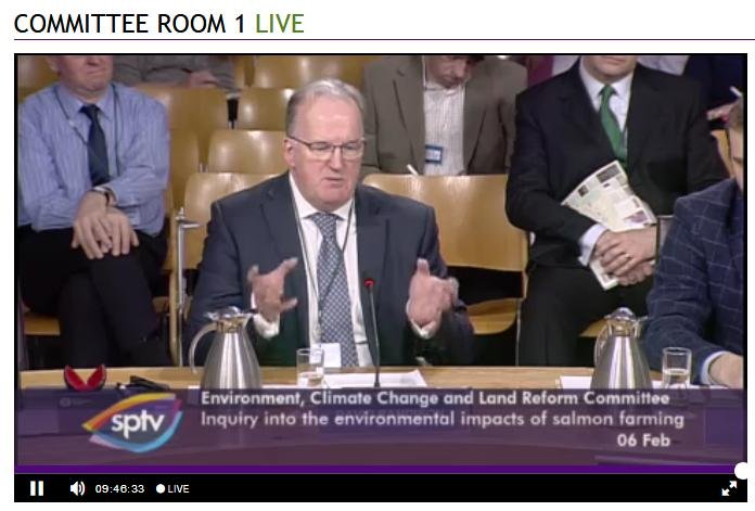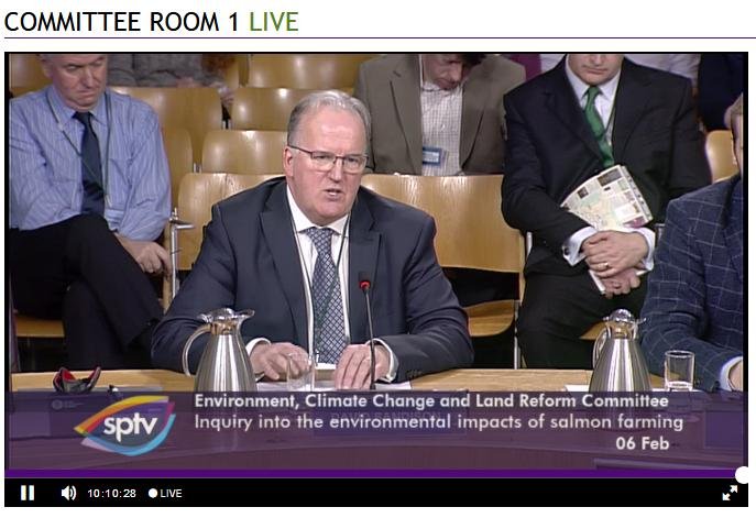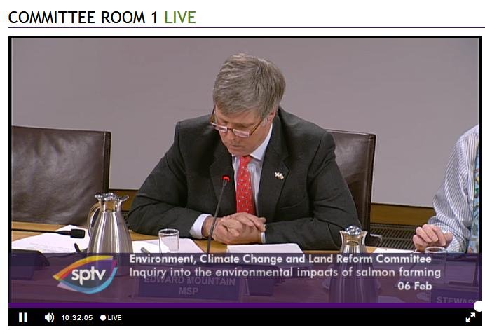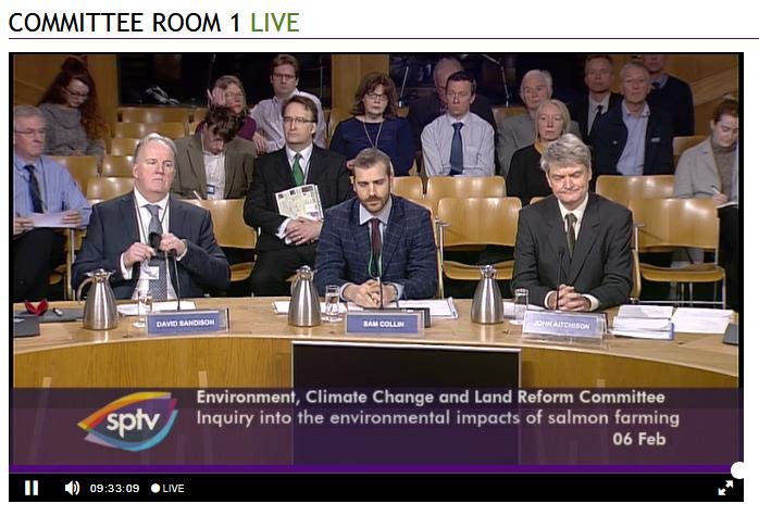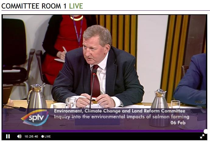 David Sandison representing the Scottish Salmon Polluters Organisation (aka The Scottish Salmon Producers Organisation) was well and truly grilled to a crisp at this morning's salmon farming inquiry by the 'militant' wing of the Scottish Parliament; namely the Environment, Climate Change and Land Reform Committee.