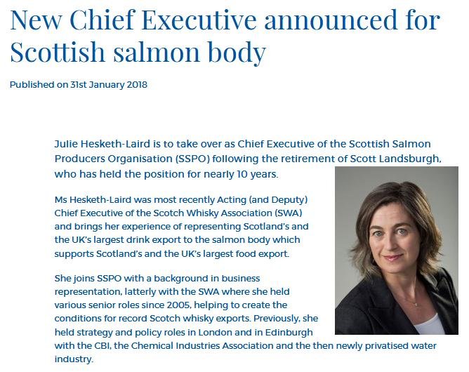 Thankfully, the new chief executive of the Scottish Salmon Polluters Organisation (Julie Hesketh-Laird) was chief executive of the Scottish Whisky Association.
