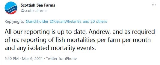 Yet Scottish Sea Farms claimed last week that "all our reporting is up to date". Scottish Sea Farms Tweeted (6 March 2021):