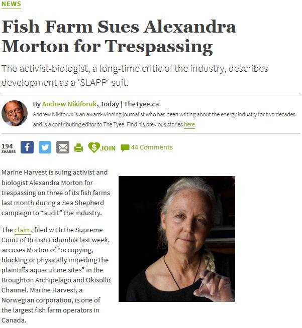 The Tyee reported (30 September): "I think we are going to have a chance to see what bullies they are," said Morton, who described the development as a Strategic Lawsuit Against Public Participation (SLAPP). Such suits are intended to silence critics of an industry by burdening them with the cost of a legal defence"
