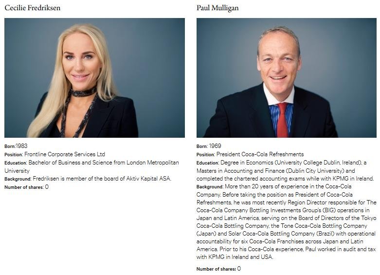 Marine Harvest's board of directors include John Fredriksen's daughter Cecilie Fredriksen as well as an executive of Coca Cola and Harvard Business School graduates.