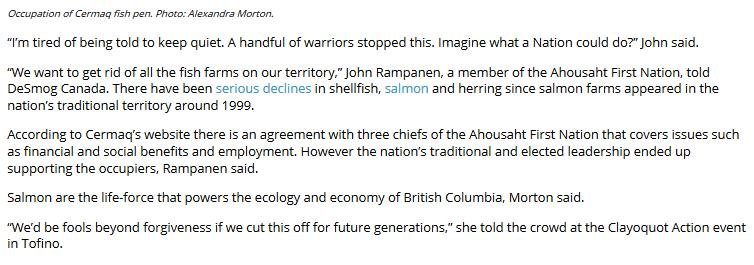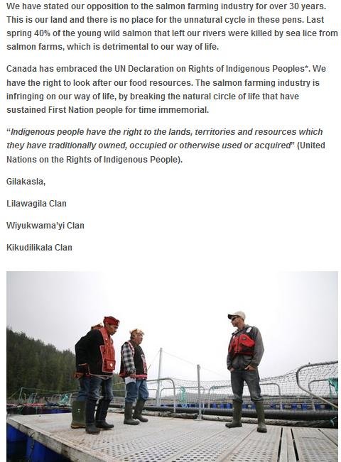 A letter sent to Justin Trudeau in August included: "We, the Musgamagw Dzawada’enuxw view the destruction of wild fish and marine ecosystems by the fish farming industry as part of the long history of genocide forced on our people by the governments of Canada".