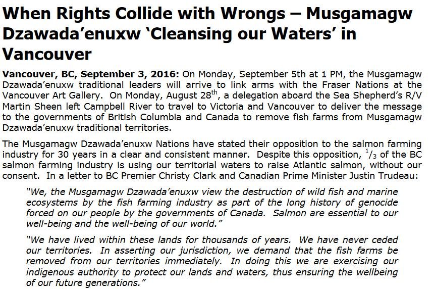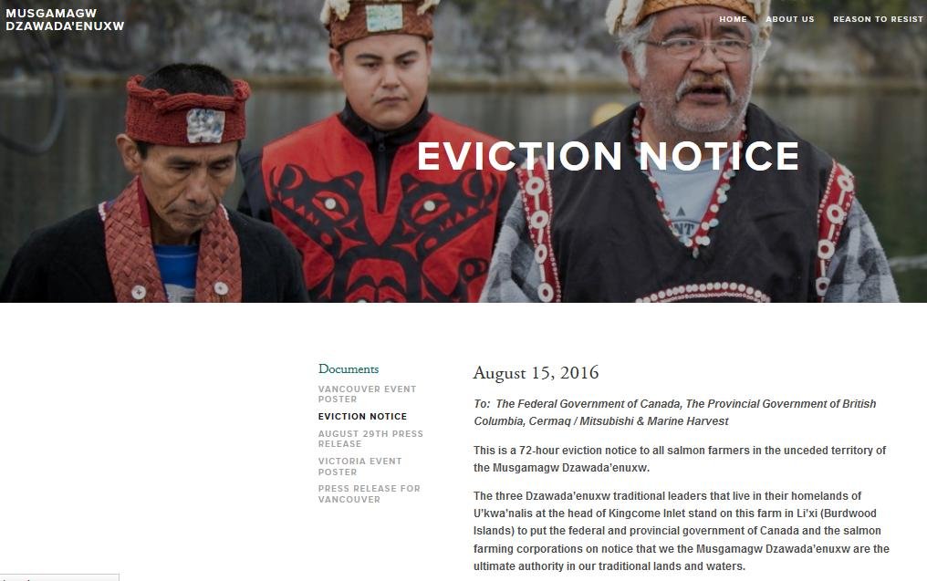 An 'eviction notice' issued by the Musgamagw Dzawada’enuxw on 15 August left the Federal Government of Canada in no doubt that the salmon farming corporations Marine Harvest and Cermaq were not welcome in the unceded territory of the Musgamagw Dzawada’enuxw.