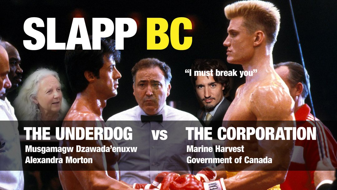 The forthcoming legal battle in the Supreme Court of British Columbia between "Alexandra Morton, John Doe, Jane Doe and other persons unknown" (the Defendants) and Norwegian salmon farming giant Marine Harvest (the Plaintiff) has underdog victory written all over it – think of David Vs Goliath or Rocky Balboa Vs Ivan Drago.