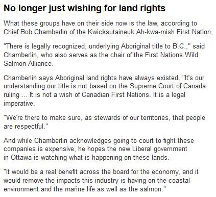 Whilst the salmon SLAPP will be headlined by many commentators as 'Morton Vs Marine Harvest' the fascinating undercurrent of First Nation Vs The Corporation could rise to the surface. As my previous blog - Who's Calling Who A Trespasser? – suggested: it will be interesting to see how a Norwegian multinational (owned by Cypriot-based Norwegian billionaire John Fredriksen along with Clearstream Banking and J.P. Morgan Bank in Luxembourg, State Street Bank & Trust in the USA and Canada, Citibank in the USA, Jupiter European Fund in Great Britain ans various Norwegian investment funds) intends to prove "trespass" against native leaders who have aboriginal title, indigenous rights, 13,000 years of history and the law on their side.