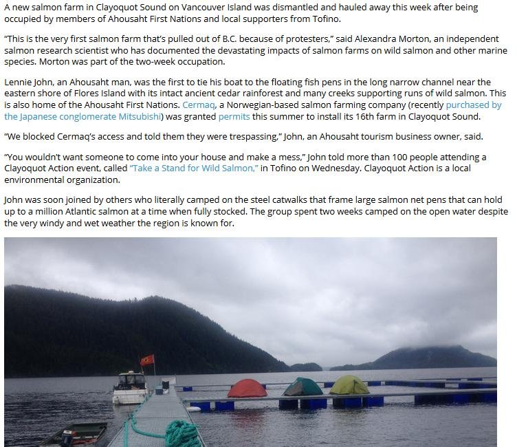 Also watching with interest will be the Yaakswiis Warriors in Clayoquot Sound who were arrested in August for obstructing a salmon farm operated by the Japanese giant Cermaq (owned by Mitsubishi).