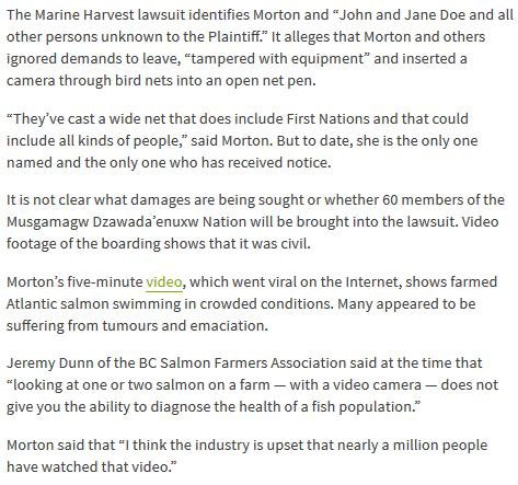 Vincent Erenst, Managing Director, Marine Harvest Canada said in a press release announcing the legal action: "We cannot stand by and allow individuals to ignore the law and trespass on our facilities."