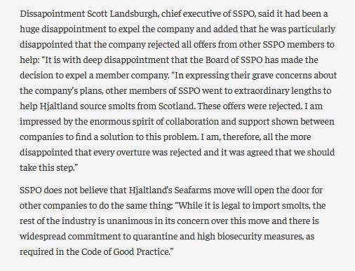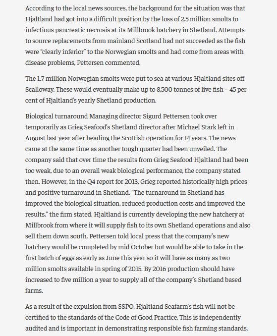 I understand that Grieg was kicked out of the SSPO in 2014 for breaching the three month quarantine rule when they imported smolts from Norway: