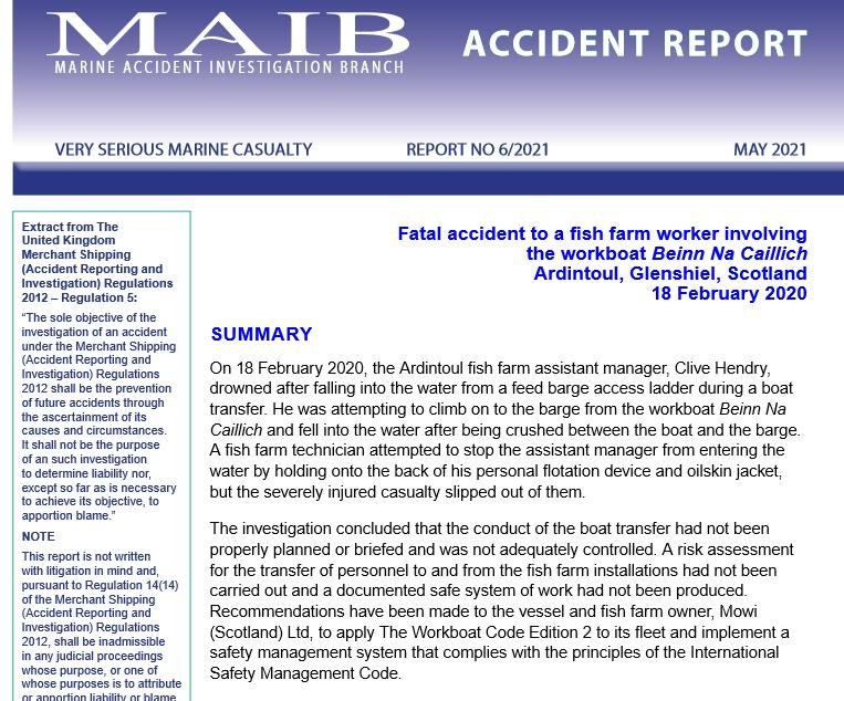 MAIB reported in May 2021 on the circumstances surrounding the death of Clive Hendry at Mowi's salmon farm in Loch Alsh in February 2020: