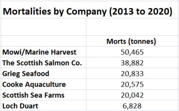Mowi (who changed their name from Marine Harvest in 2019 due to "negative consumer perception") head the list of mortalities by company since 2013. These six companies – all foreign owned/controlled – account for 99% of 'Scottish' salmon farming production.