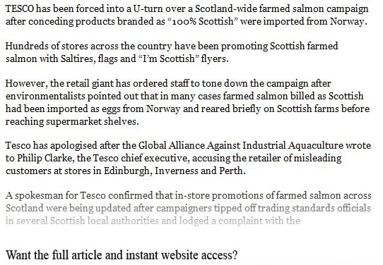 In 2014, Tesco was forced into a u-turn over the labelling of 'Scottish' salmon. Following complaints filed with Trading Standards and the Advertising Standards Authority, Tesco has been forced into an embarrasing U-turn over their "100% Scottish Salmon" and "I'm Scottish" campaign – read exclusively in The Sunday Times: "Tesco in U-turn over ‘red herring’ of Scots salmon promotion".