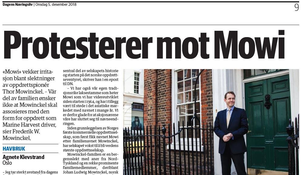 Mowi changed their name from Marine Harvest in 2019 due to what their CEO admitted was "negative consumer perception" despite vehement objections filed by the Mowinckel family (who lent their name to Mowi via salmon farming pioneer Thor Mowinckel).