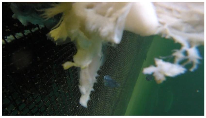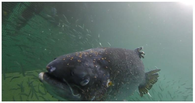 And wild fish swimming inside the cages with lice-infested salmon (a lumpfish can be seen on the side of the cage ignoring the lice-infested salmon):