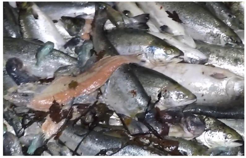 When Scottish Salmon Watch visited Mowi’s Loch Torridon salmon farm in November 2018 we found dead cleaner fish – both wrasse and lumpfish – dumped in mort bins along with diseased farmed salmon: